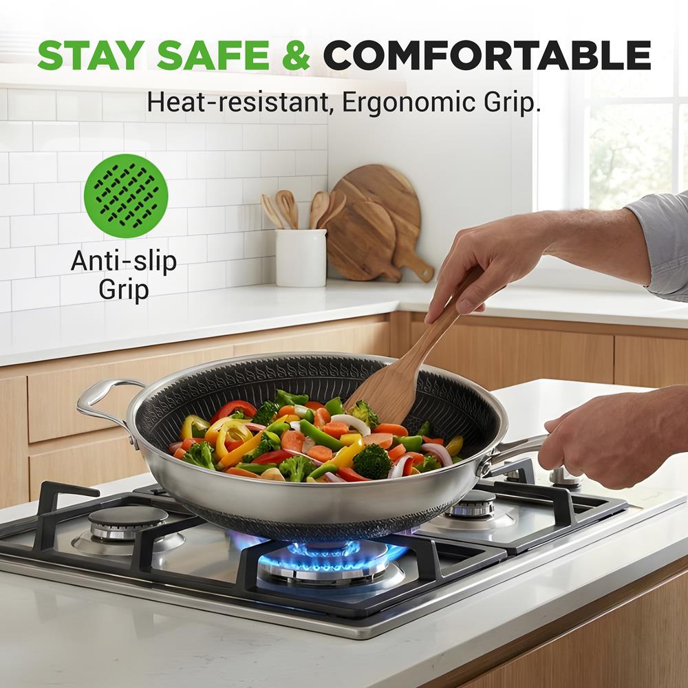 - Raised-up Honeycomb and Fire Textured Pattern Forms an Outstanding and Scratch-resistant Surface, Metal Utensils Safe