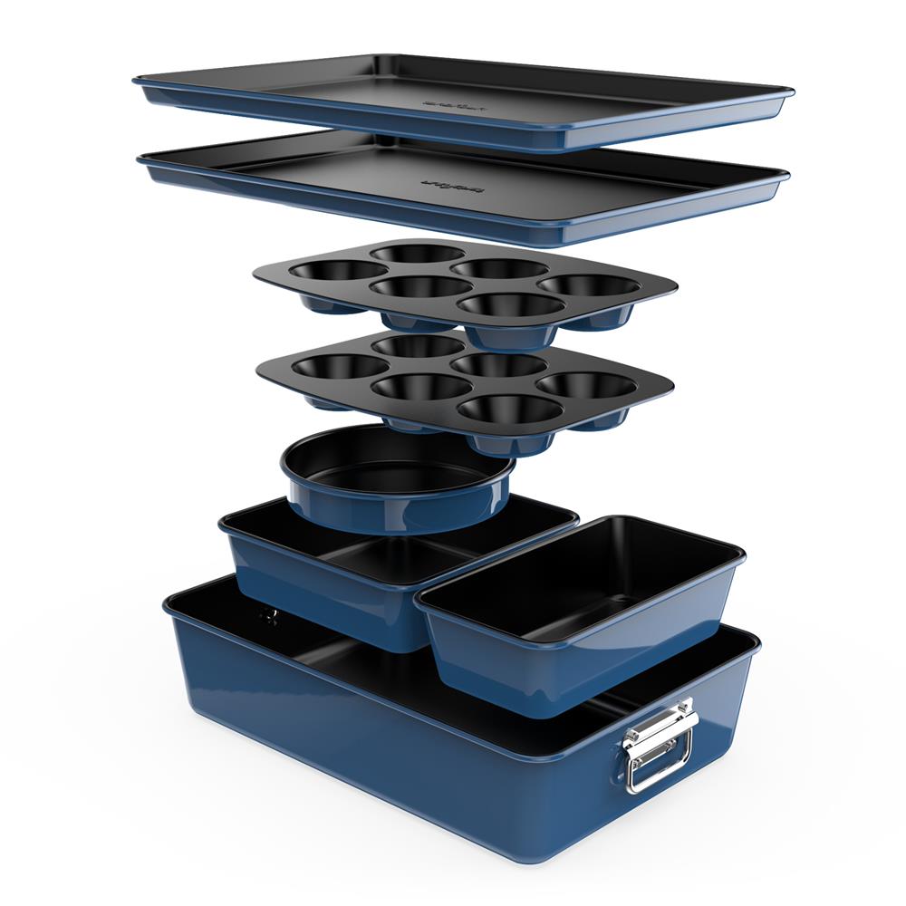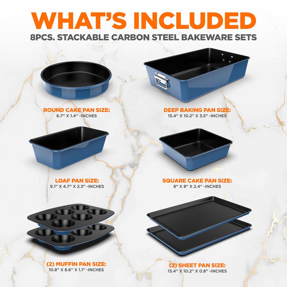 8Pcs. Stackable Carbon Steel Bakeware Sets - Non-Stick Coating, Bake Tray Sheet Bakeware Set (Blue)