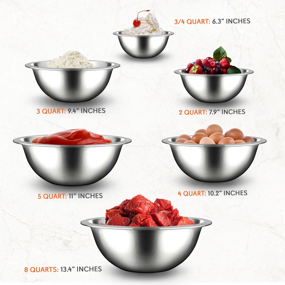 - 6 PIECE SET: The stainless steel mixing bowls set features 6 bowls w/ various sizes including 3/4, 2, 3, 4, 5, 8 quart for hassle-free food serving, baking, cooking prep. Great for whisking, beating, mixing large batter, tossing salad, and marinating