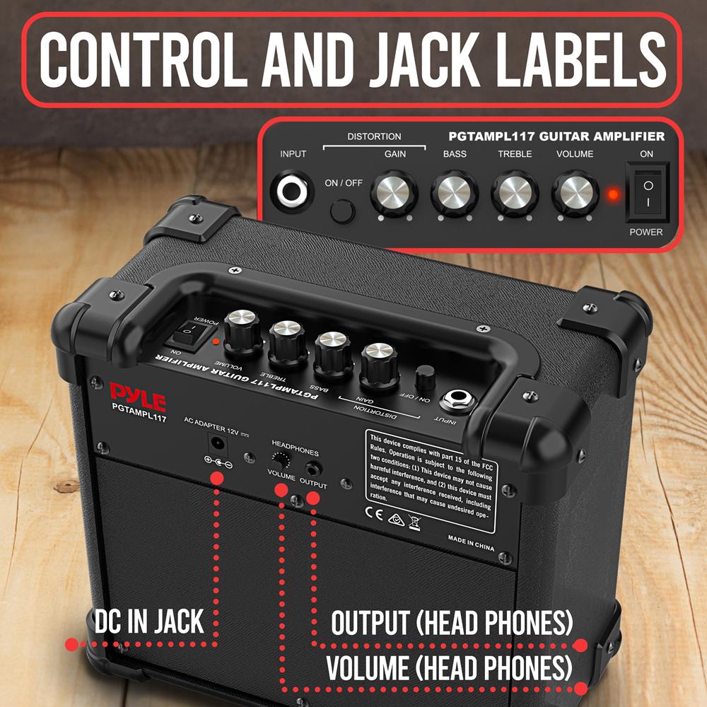 - Functions: Input, Drive Switch, Volume, Treble, Bass, Headphone Output