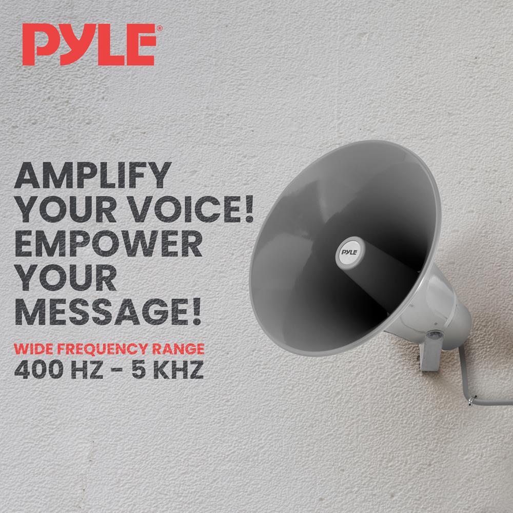 This 13.5” indoor/outdoor horn speaker is great for your 70 V audio system. Perfect for outdoor PA systems when you need your sound heard far and wide. This 50 watt speaker includes a 70 V transformer tappable at 50, 25, and 12.5 watts. Includes mounting bracket and hardware for easy installation. Let your voice be heard with the PHSP131T. Color: grey.