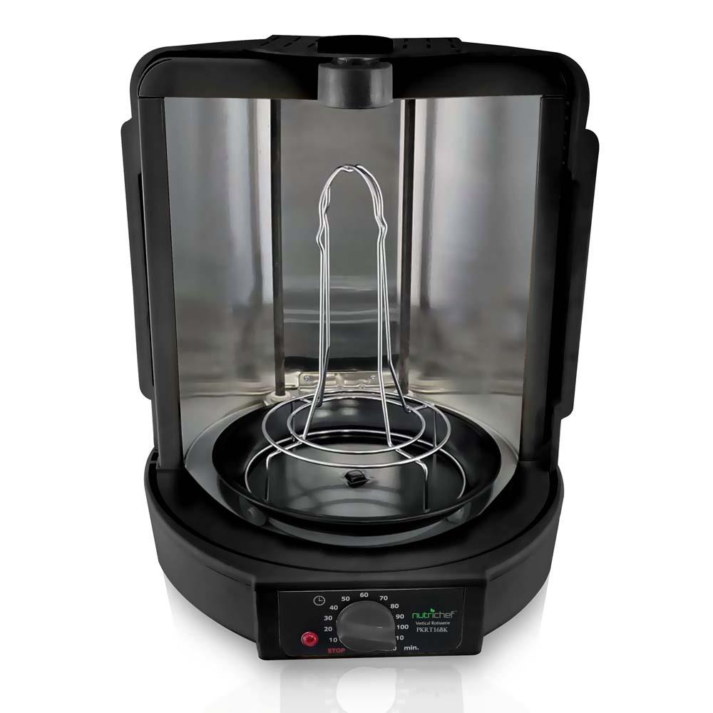 Rotisserie roast your favorite foods with healthy and tasty results! The NutriChef Vertical Countertop Rotisserie Rotating Oven provides you with hassle-free food prep ability. Use the included poultry rack or skewer tower and insert your favorite meats. The spinning-style design effectively cooks your foods while the dual heating elements evenly distribute the heat. It creates more moist and healthy results as excess food fat drains into the drip tray below. Operation is simple -- insert your food, set the rotary timer and the oven does the rest! It's perfect for chicken, turkey, beef, steaks, seafood, kabobs and more! Your food is seared on the outside, with the ability to create crispy skins while maintaining a flavorful and juicy bite. Save time and money thanks to simple food preparation with the NutriChef Vertical Countertop Rotisserie Rotating Oven.