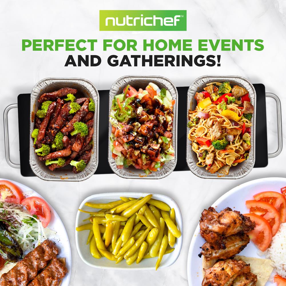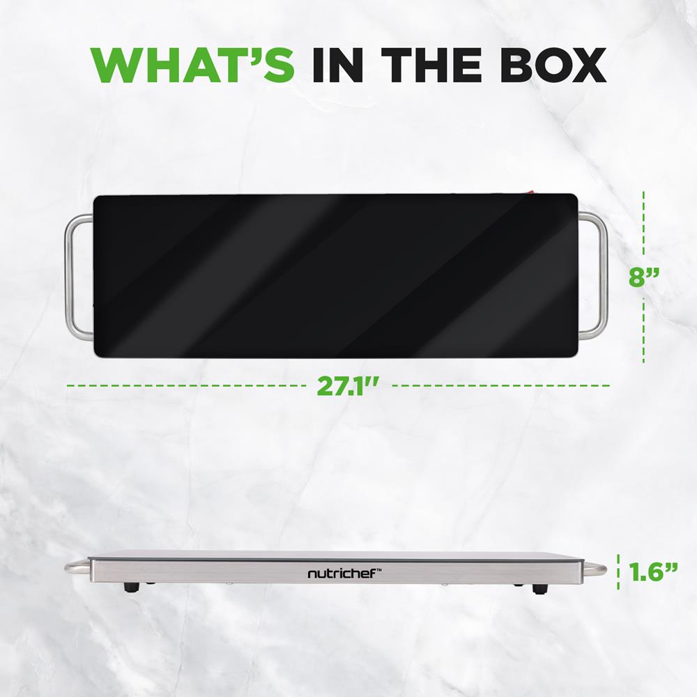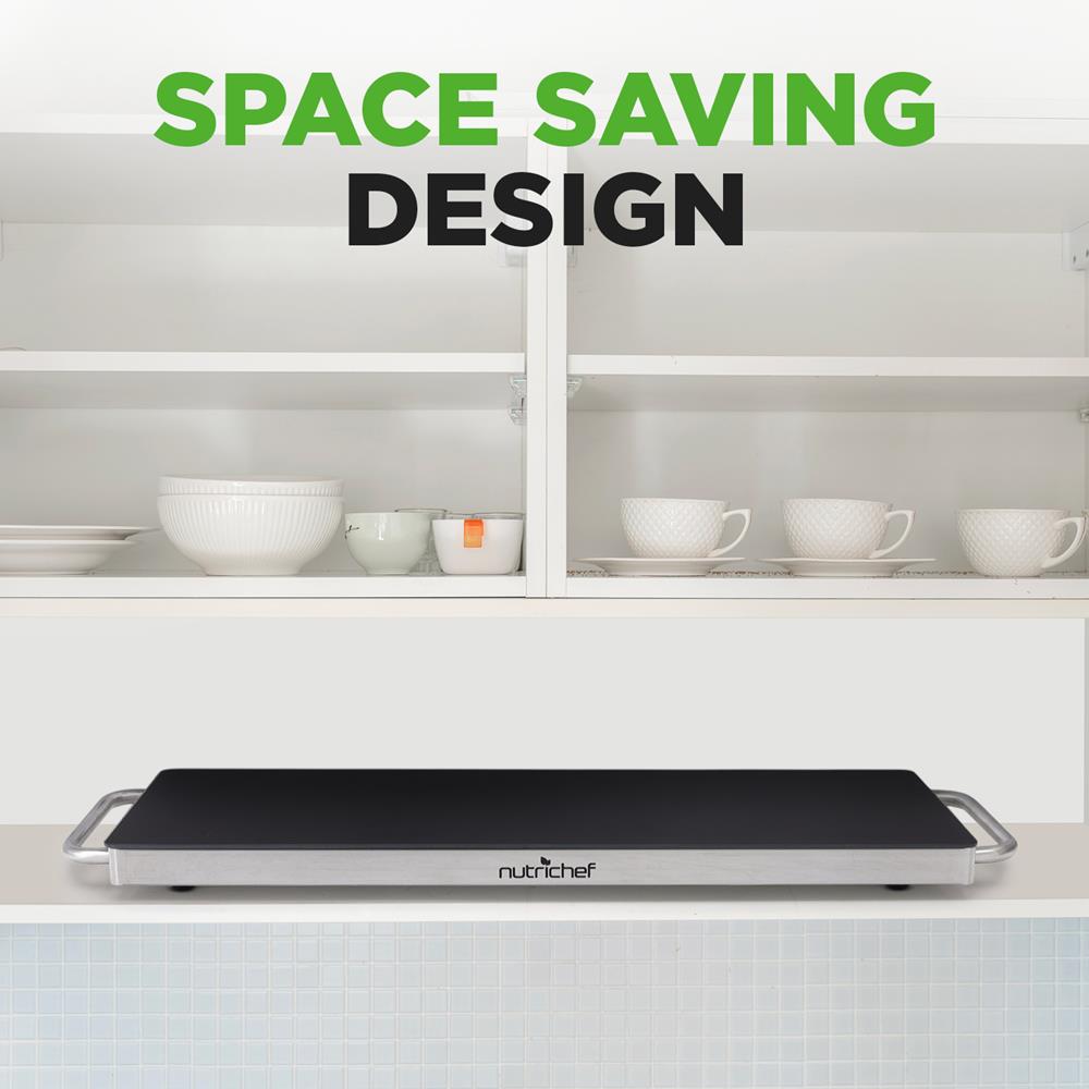The NutriChef Electronic Warming Tray provides convenient and hassle-free food prep ability. The tabletop design resembles a buffet warming hot plate -- that features sleek stainless steel construction and non-stick, heat-resistant tempered glass. The high-powered heating element heats quickly and the ultra-thin space saving design is safe for placement on any table or counter. Use the warming tray with baking sheets, casserole dishes or just about any other heat-resistant cookware in your kitchen. Heat your food up to 203°F while the cool-touch carry handles allow for safe food transport. Enjoy energy efficient and convenient food prep ability with the NutriChef Electronic Warming Tray.