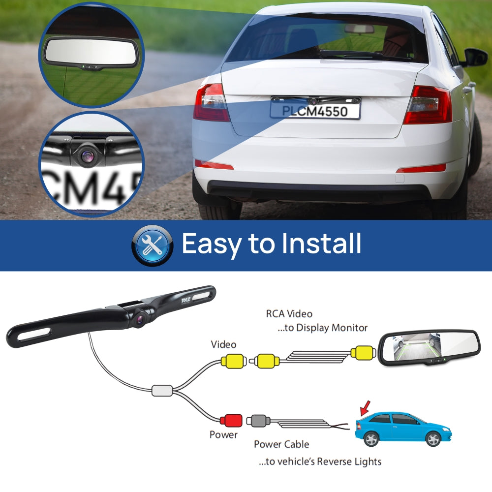 The Pyle Rearview Backup Parking Assist Camera & Display Monitor System Kit, Waterproof License Plate Mount Night Vision Cam, Angle Adjustable, Auto Reverse Activation, Distance Scale Lines, 4.3'' Screen - Kit Includes Rearview Mirror Monitor Assembly + Backup Camera - Includes All Necessary Installation Cables/Wires - Backup/Reverse Camera Trigger - (Automatically Activates When Placed in Reverse Gear) - On-Screen Rearview Distance Scale Line Display - Mirror Monitor: - Easy Setup: Replaces Your Existing Rearview Mirror - 4.3'' LCD Display Built-into Mirror Panel - Ability to Connect up to (2) Video Sources - RCA Video Connector Types - Aspect Ratio: 16:9 - Video System: PAL/NTSC - LCD Display: ON/OFF - Size: (L x W x H): 10.6'' x 3.5'' x 1.8'' - Power: DC 12V - Camera: - Marine Grade Camera Construction.