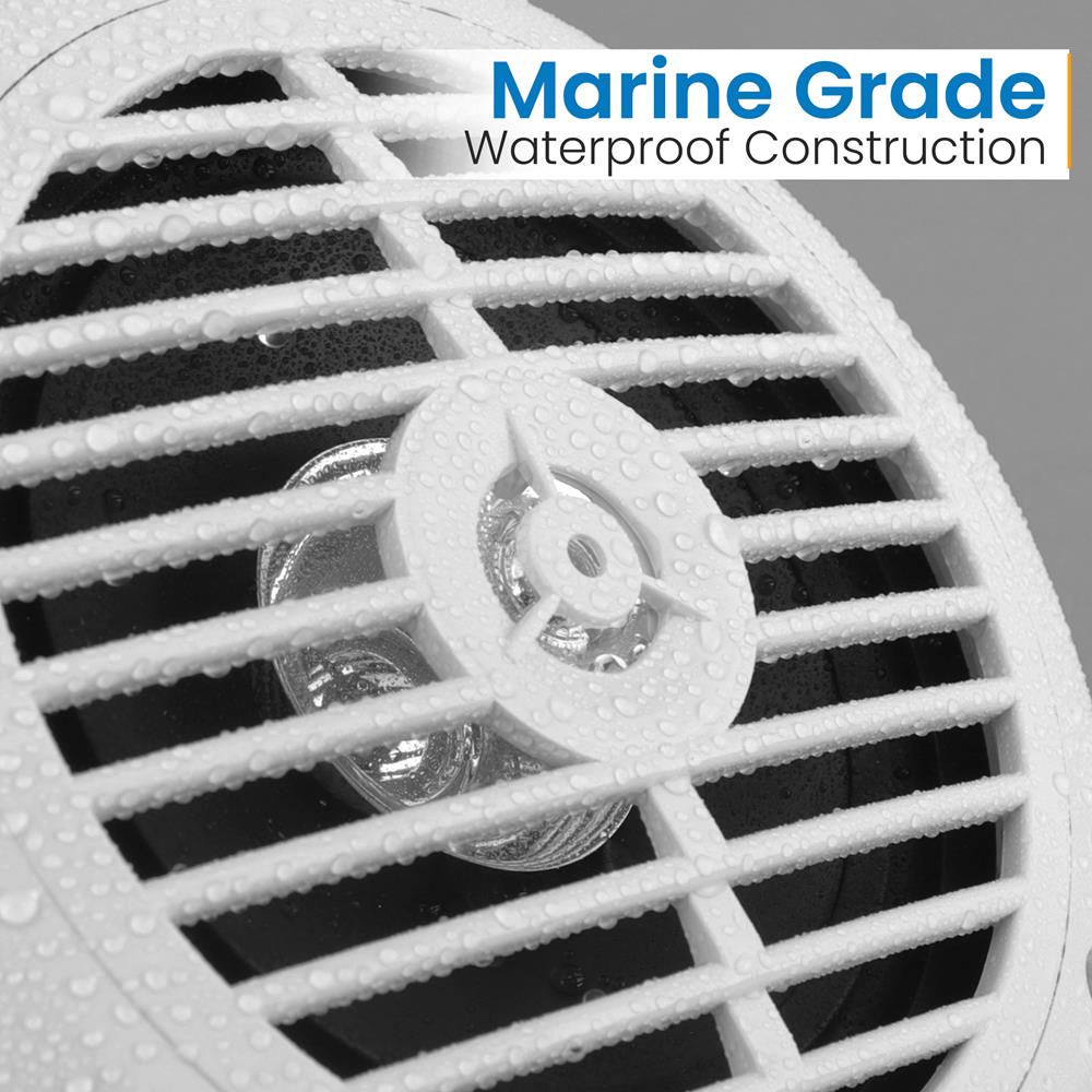 6-1/2-Inch Dual Cone Full Range Speakers Completely Waterproof For Marine or Car Door Use Polypropylene Cone w/ Cloth Surround Built-In Molded Grill Molded ABS Plastic Basket 1-Inch Aluminum Voice Coil 20 Oz. Circuit Magnet Frequency Response: 45-16Khz Impedance: 4 Ohms Mounting Depth: Only 2.5-Inch Complete Pair with Wire & Mounting Hardware