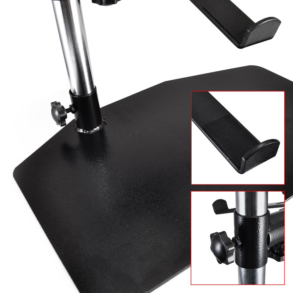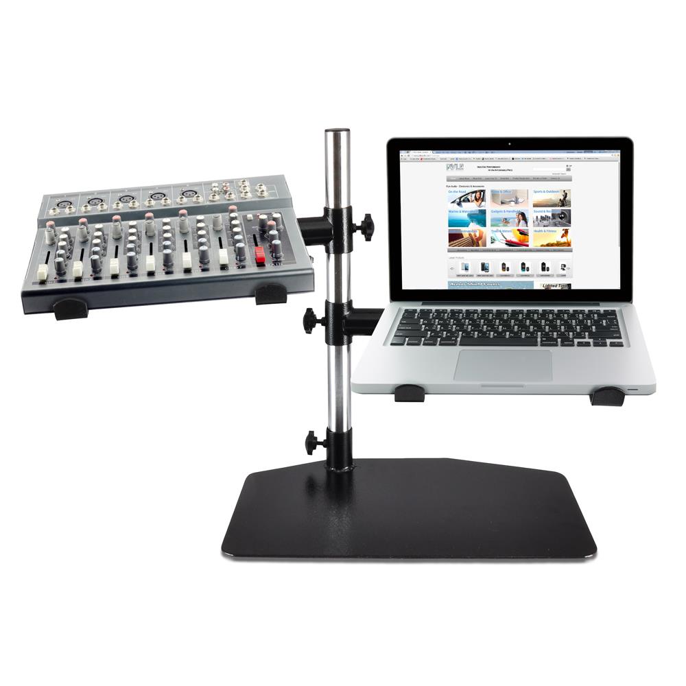 Reach new levels in your music performance, and gain convenient access to your gear, with the Pyle PLPTS45 Dual Device Tabletop Studio Equipment Stand. It's the heavy duty solution to hold all your audio equipment. The dual device mount holder arms are height adjustable and can raise or lower your gear from 3.5" to 15.7". Universal bracket arms are also width adjustable so it can hold devices like laptops, mixers, turntables and more. Enjoy 360 degree full rotation swivel adjustments along with device tilting ability. This heavy-duty tabletop stand provides rugged and reliable performance -- all within arm's reach! Adjust, position and angle your equipment exactly where you need it, and achieve optimum performance with the Pyle PLPTS45 Dual Studio Equipment Stand.