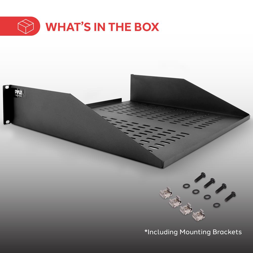 The 2U Server Rack Shelf is Used for Electronics, Musical Equipment, Recording Studios and More - Universal Device Placement Rack - Works with Both Non-Rack & Half-Rack Equipment - Punch-Out Shelf Bottom Allows for Ventilation - Promotes Safety & Air Circulation - Rugged & Heavy-Duty Metal Construction - Perfect for On-Stage or In-Studio Use - Compatible with All 19’’ Server Racks - Construction Material: Steel - Compatible Rack Shelf Size: 2U - Maximum Weight Load Capacity: 110 lbs. - Shelf Tray Size (L x W): 17.6’’ x 14.7’’ - Total Size: (L x W x H): 19.0’’ x 14.7’’ x 3.4’’ (Including Mounting Brackets) - Unit Weight: 5.64 lbs. - Model: PLRSTN22U.