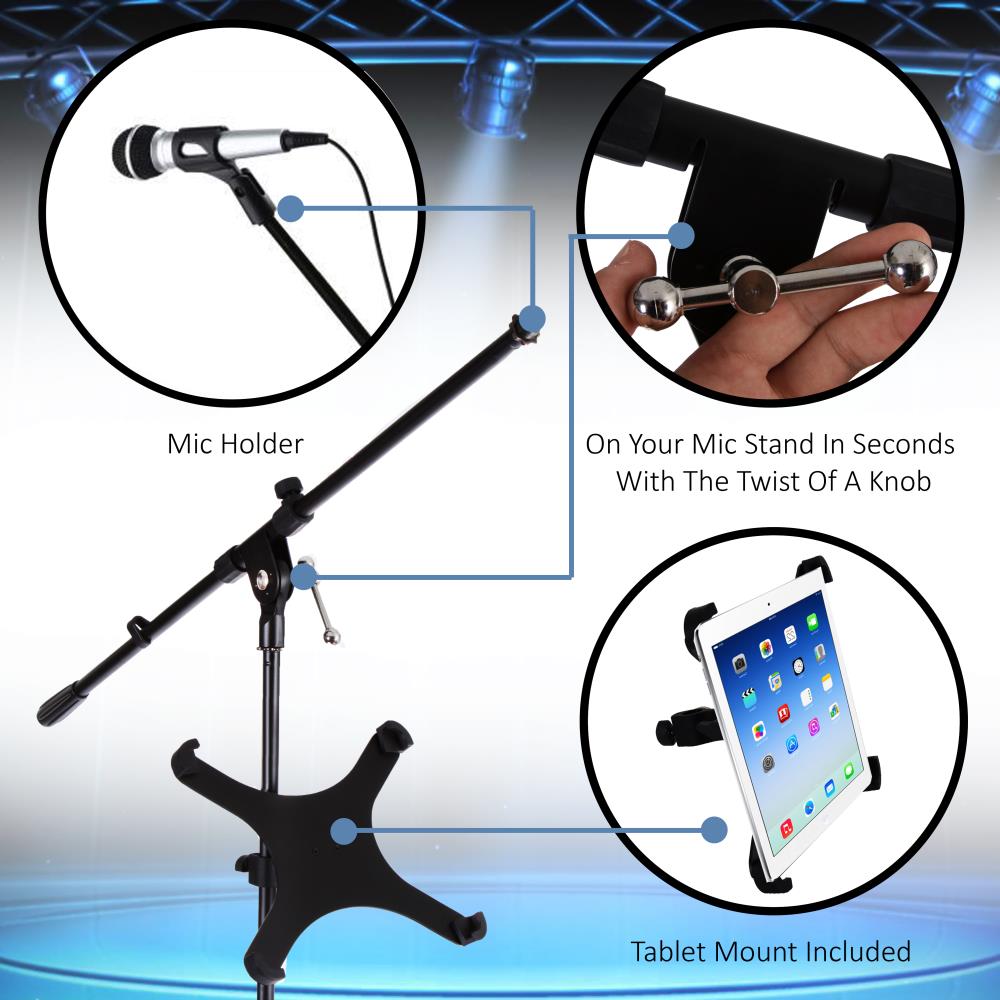 The PMKSPAD7 is an innovative new stand adaptor from Pyle that allows you to use a microphone stand to hold your iPad. It securely holds your iPad with sure-grip touch points, preventing scratching or marring. Easily snap it in or out with the quick-snap clips. And to install, you just have to screw it on to your microphone stand. Use it on the boom for increased mobility, or place it vertically on the stand for stability. The iPad can be used in portrait and landscape modes.