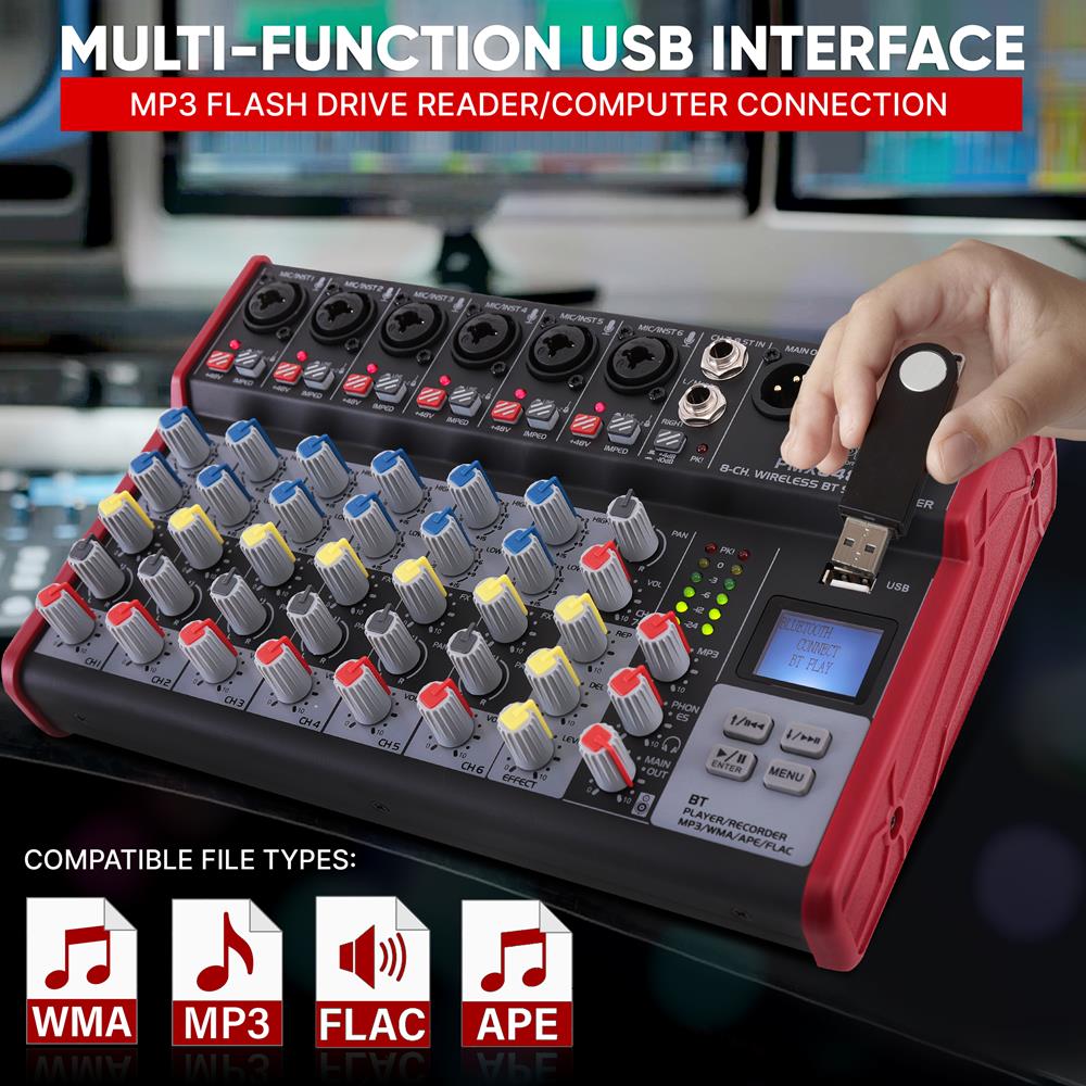 Amazon.com: Professional Wireless DJ Audio Mixer - 8-Channel Bluetooth Compatible DJ Controller Sound Mixer w/ USB Port, 6 Mic/Line Input, ¼” Mono/Stereo Input, Headphone Jack, +48V Phantom Power - Pyle PMX848BT : Musical Instruments