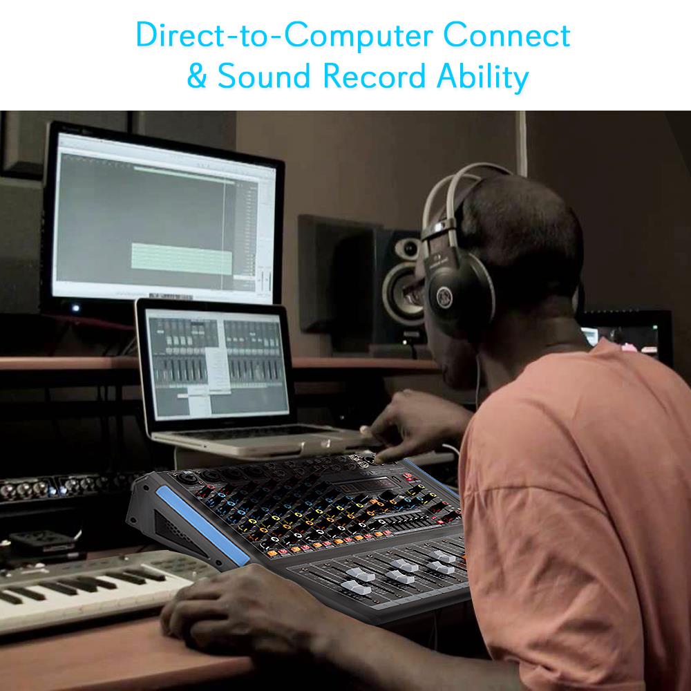 The Pyle 8-Ch. Bluetooth Studio Mixer - DJ Controller Audio Mixing Console System - DJ & Studio Console Mixer System - Multi 8-Channel Audio Source Mixing - Built-in Bluetooth Wireless Receiver - FX (Analog Effects) & 16 Bit DSP processor - Direct-to-Computer Connect & Sound Record Ability - 7-Band EQ - 32-Bit Dual Engine DSP - 24-Bit ADC DAC Converter - FX Configuration Adjustment Controls - Rotary Adjustment Knobs & LED Indicator Lights - MP3 Digital Audio File Compatibility - USB Flash Drive Reader - USB Port for Desktop Connection - Connect & Stream Audio from External Devices - (2) 1/4’’ (L/R) MAIN Outputs.