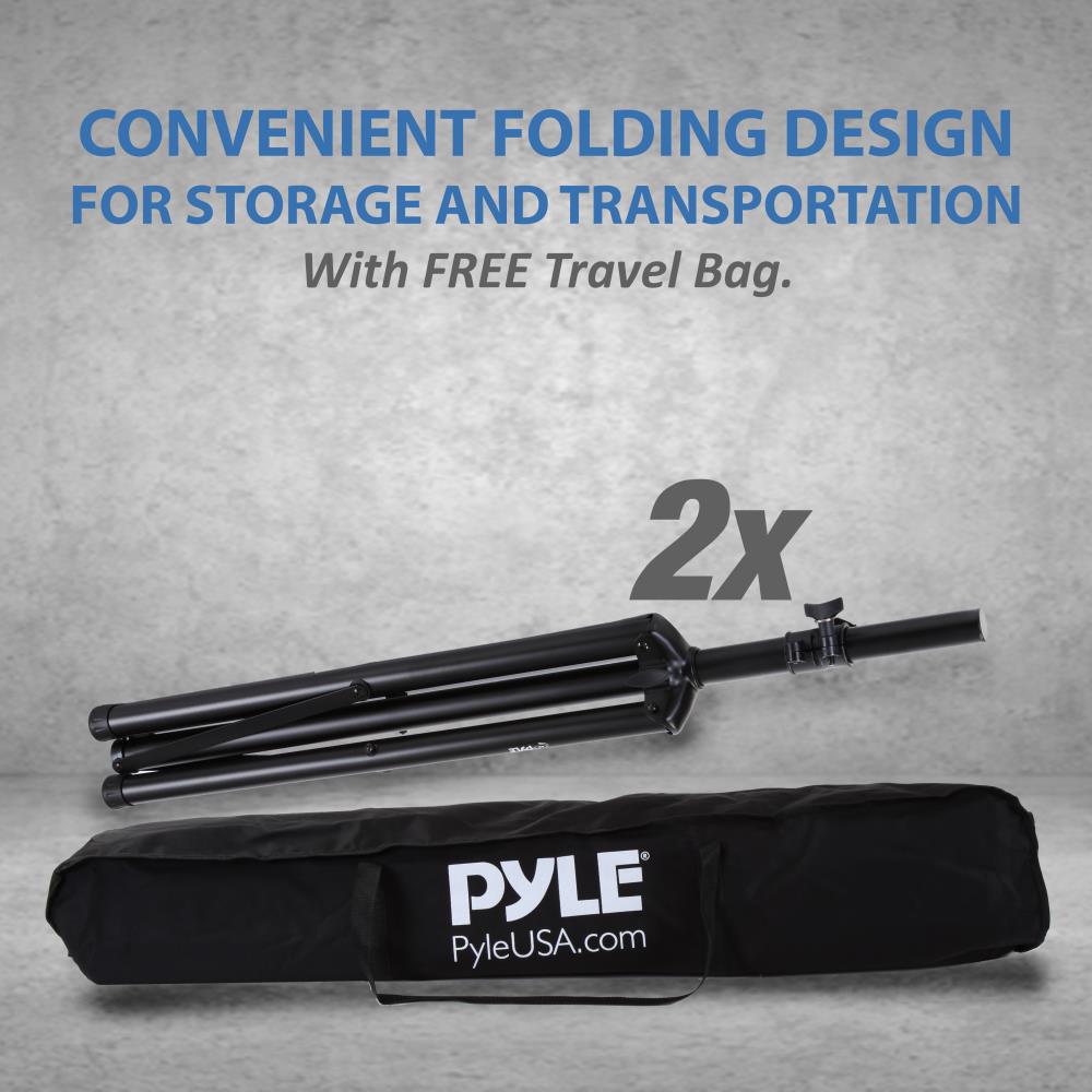 The Pyle Dual Universal Speaker Stand Mount Holders, Height Adjustable - Universal Floor-Standing Speaker Stand Mounts - Works with All Speakers with 35mm Compatible Insert - (Loudspeakers, PA Speakers, Stage/Studio Monitors, etc. - Quick and Easy Telescoping Height Adjustment, 40’’ - 71’’ -Inches - Locking Safety Pin for Secure Placement - Rugged and Durable Metal Construction - Reinforced Engineered Tubing - Convenient Folding Design for Storage & Transport - Knob-Style Tension Locking Mechanism - Perfect for On-Stage or In-Studio Use - What’s in the Box: - (2) Adjustable Speaker Stands - Storage/Travel Bag - Technical Specs: - Tubing Thickness: 35mm (1.375'') Standard - Maximum Speaker Weight Load Capacity: Up to 132 lbs. - Opened Single Speaker Stand Dimensions (L x W x H): 58.0’’ x 58.0’’ x 76.0’’.