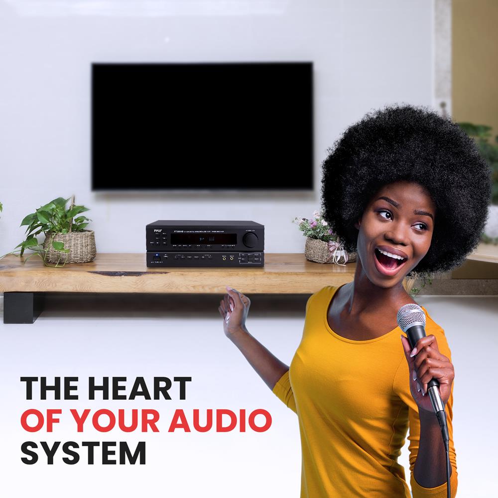 The PT588AB is a versatile digital home theater receiver system from Pyle Audio. It's equipped with 5.1 audio output for rich, enveloping sound that's perfect for movie night, sports events, and your favorite video games. The system features 4 HDMI outputs along with 3D pass-through capability, making it ready for any of today's latest Blu-ray players or video game consoles. Receiver compatibility also features an HDMI switcher, a convenient way to connect multiple HDMI devices through a single HDMI port. Additional features include AM/FM radio with 12 station memory presets, BT wireless streaming ability that works with all of your favorite devices, speaker terminal binding posts for connecting additional speakers, multiple microphone input ports for karaoke night -- and it's all housed in this high-powered 420 watt receiver! Integrated voltage and circuitry protection adds another line of safety for your connected devices. Upgrade your entertainment system and enjoy a truly unique multimedia experience with the Pyle PT588AB Digital Home Theater Receiver System.