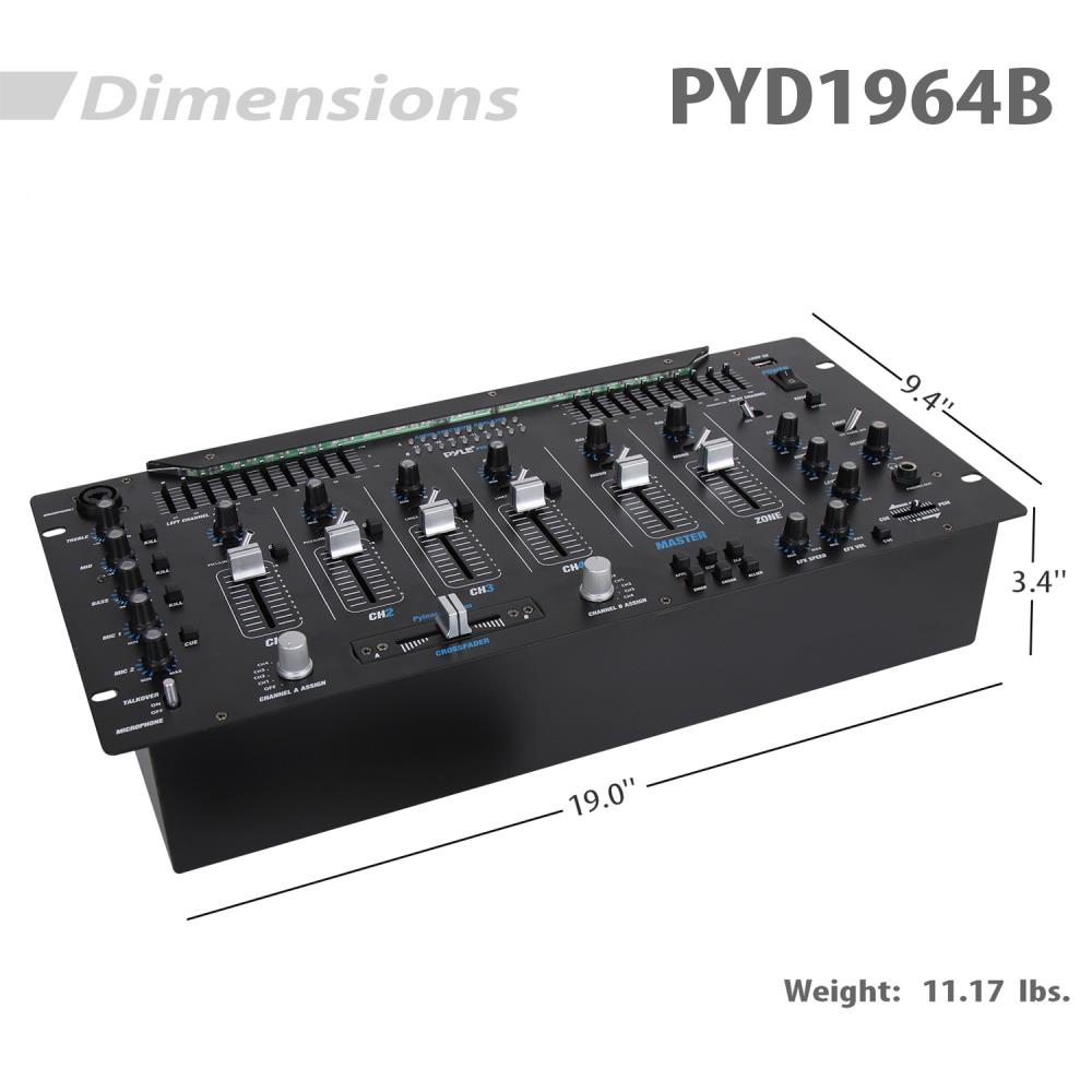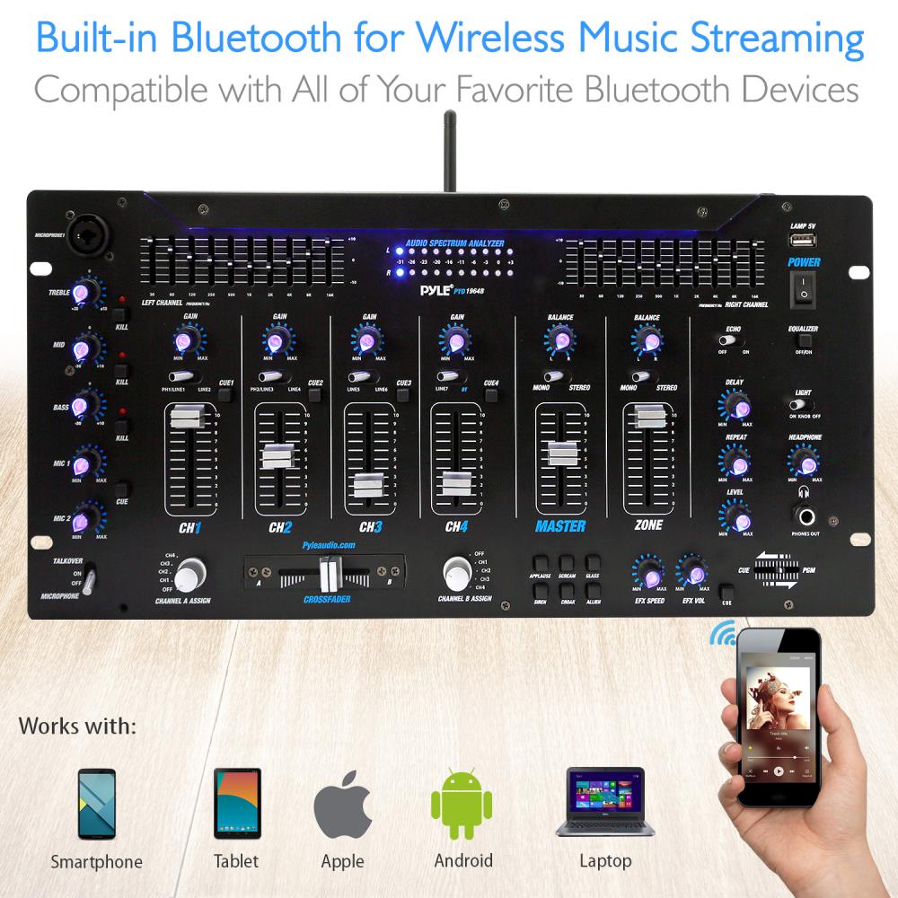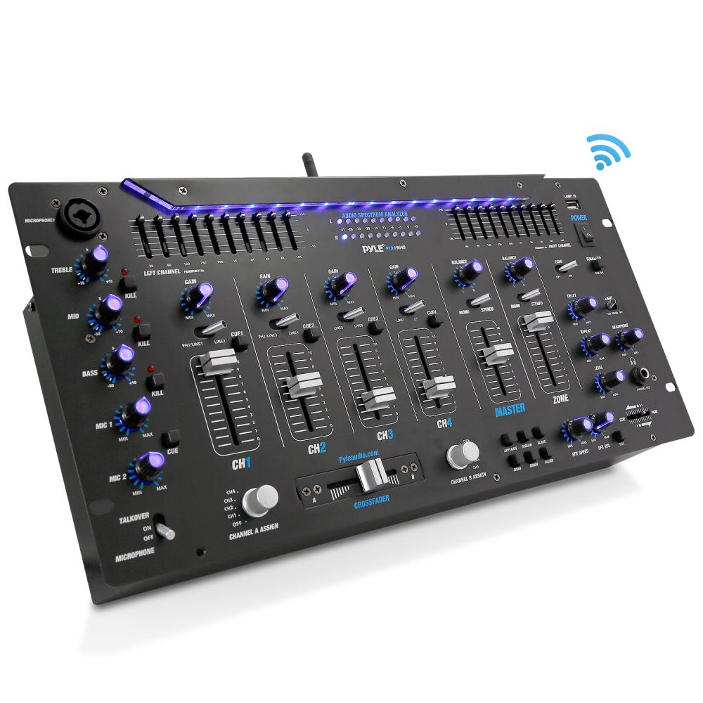 The Pyle PYD1964B with Bluetooth takes the professional DJ mixer to new heights with a groundbreaking combination of digital, Bluetooth and analog technologies. Bluetooth allows you to wirelessly transmit your entire MP3 library right into your mix from devices like your iPad, iPhone, Android Smart Phone or Tablet. Rock-solid construction, superb audio fidelity, high quality parts, and of course, reliability are the core ingredients of the design. Unique features provide Mobile and Club DJs tremendous flexibility and intuitive control. 2 phono, 8 line level and 2 microphone input signals with Bluetooth give you the freedom to move any source to any channel or even the same source to multiple channels for quick and easy remixing. Take full sound control with 10 Band graphic equalizer, echo, delay, repeat and added digital sound effects. Manipulate your voice with high, mid and bass mic adjustments, then use the KILL switch to cancel specific frequencies of your two microphone inputs for added special voice effects. Upgrade your system with the digital technology to take your DJ skills to the next level.