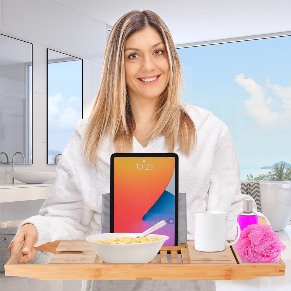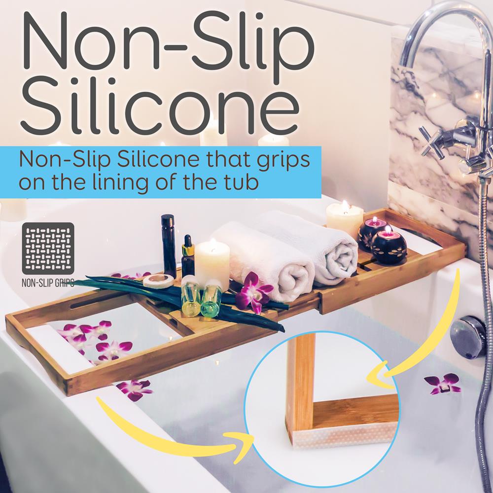The SereneLife SereneLife Luxury Bamboo Bathtub Caddy Tray - Adjustable Natural Wood Bath Tub Organizer with Wine Holder, Cup Placement, Soap Dish, Book Space & Phone Slot for Spa, Bathroom & Shower - SLBCAD20 - 100% All Natural Bamboo Shelf - Elegant Shower Caddy / Bathtub Tray - Universal Organizer for Ultimate Relaxation - Minimalistic Style & Eco-Friendly Construction - Waterproof Rated, Water & Mold-Resistant Design - Adjustable: Sturdy & Stable Extending ‘Slide-Out’ Arms - Integrated Cup & Wine Glass Grooves - Used for Smartphones, Tablets, Books & Magazine Convenience - An Essential Piece for Long & Relaxing Baths!.