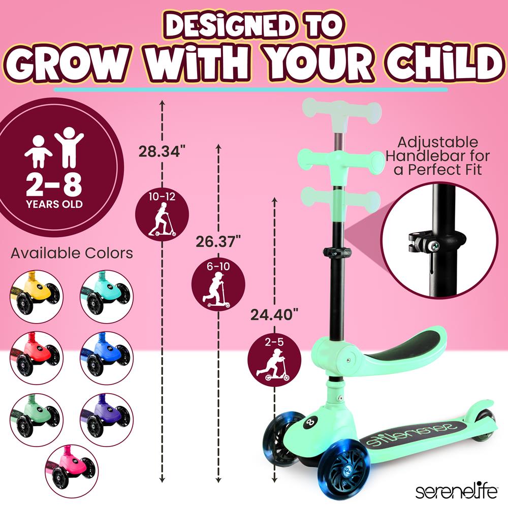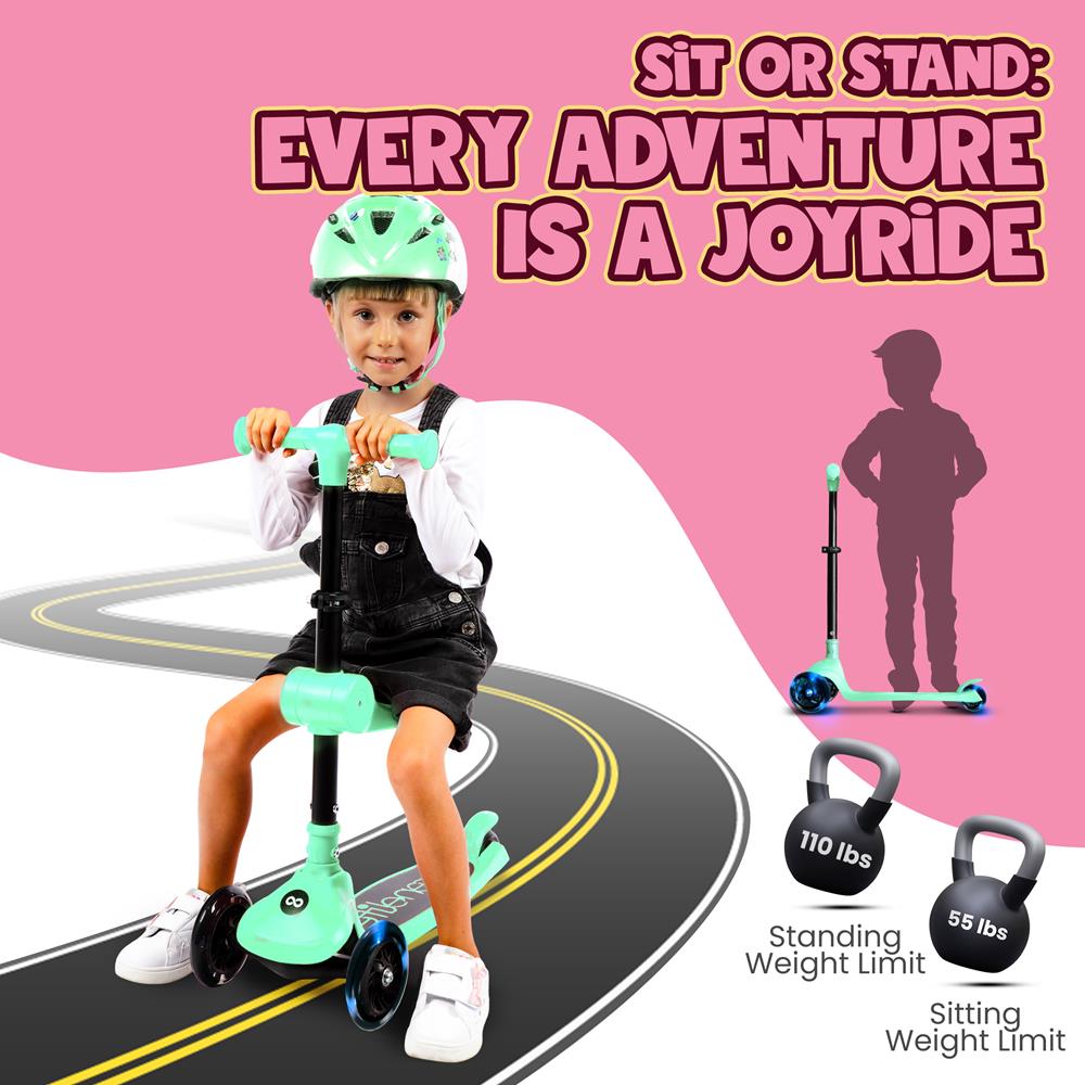 3-Wheel Kids Scooter, Foldable Seat, LED Wheels, Adjustable Handlebar, Mint Green