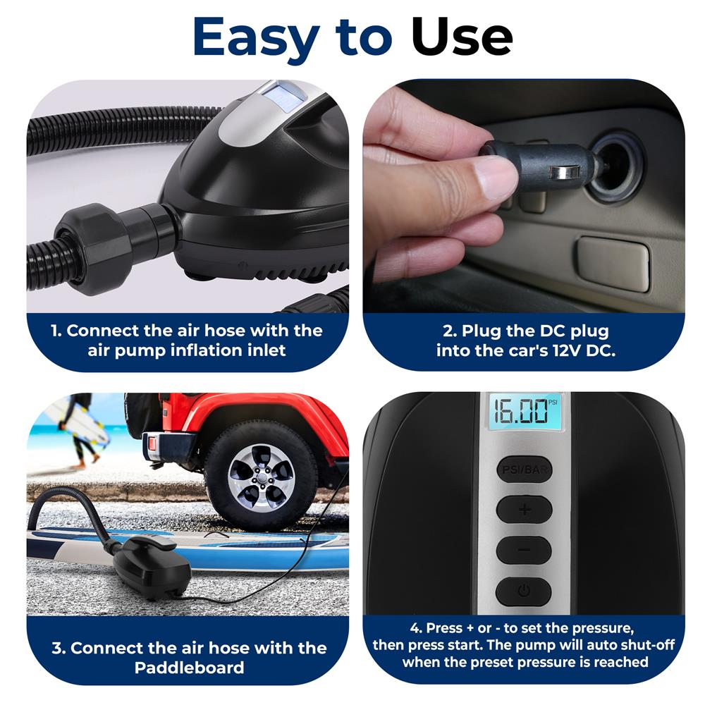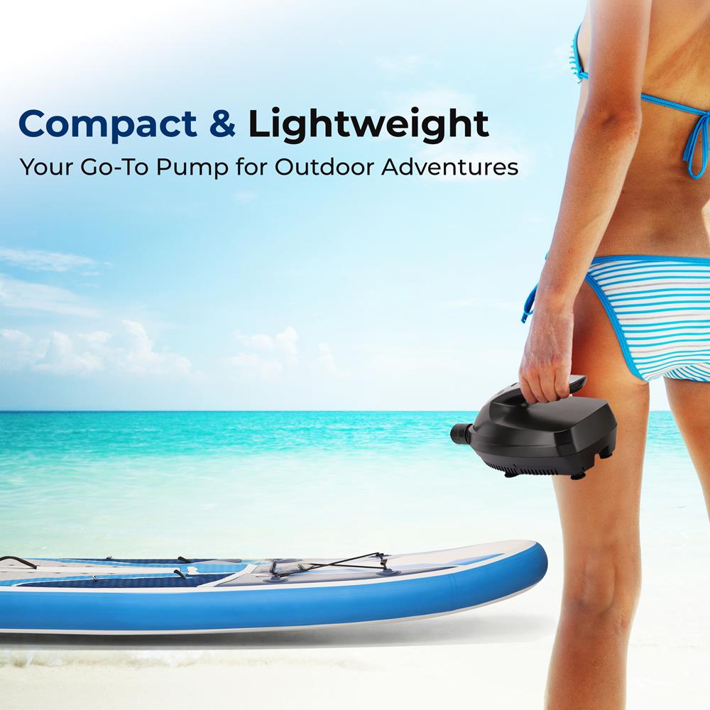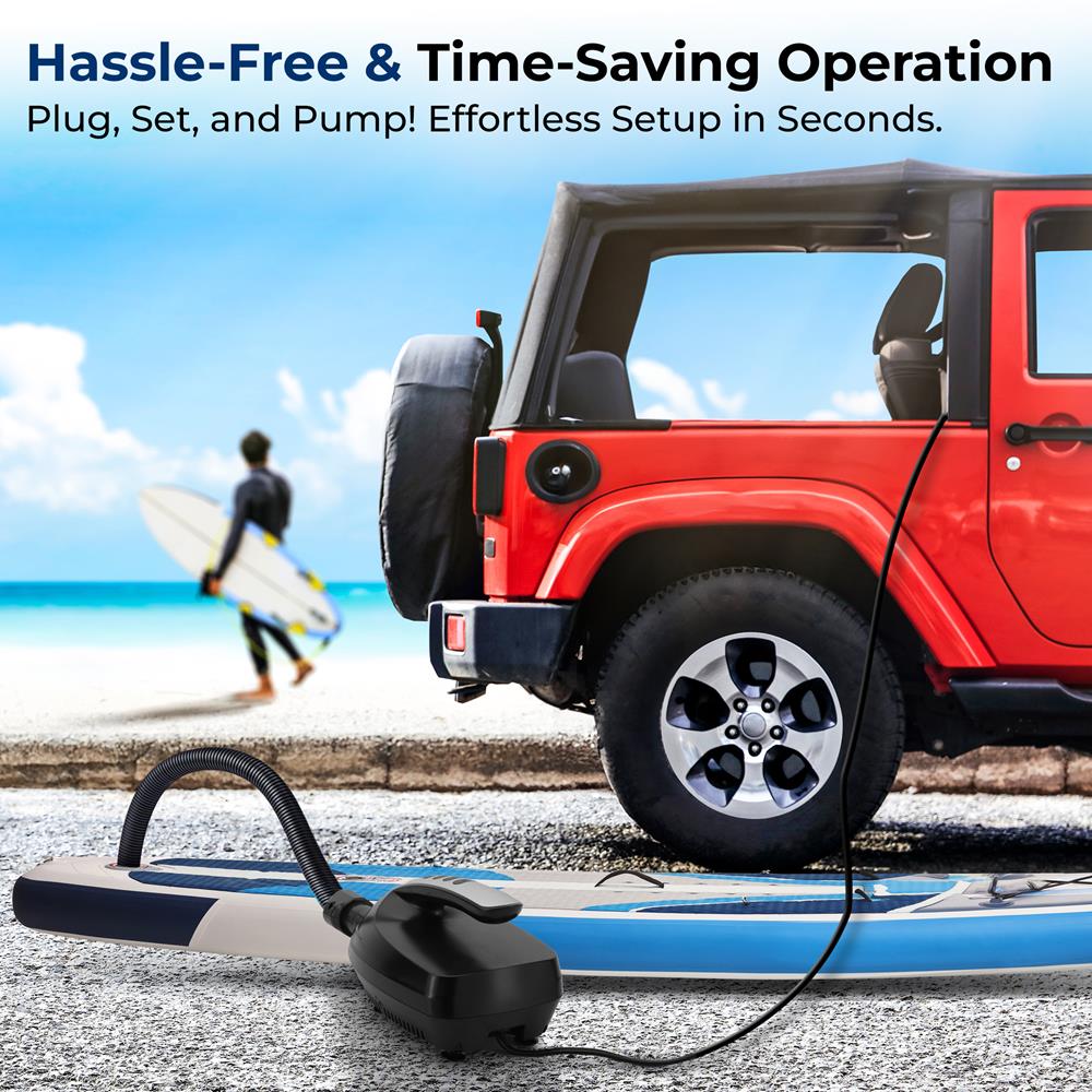 The SereneLife Electric Air Pump for SUP (Stand Up Paddle-Boards) - Compact & Portable Design - Simple & Hassle-Free Operation - Digital LCD Display & Button Controls - Adjustable PSI Air Pressure Setting - Powered via Car Power Outlet / Cigarette Accessory Jack - Detachable Air Hose - What’s in the Box: - Air Pump - Detachable Air Hose - Technical Specs: - Power: 100 Watt - Adjustable Air Pressure: 0-16 PSI - Air Hose Length: 3.3’ ft. - Power: DC 12V - Dimensions (L x W x H): 9.1’’ x 5.5’’ x 4.7’’ -inches.