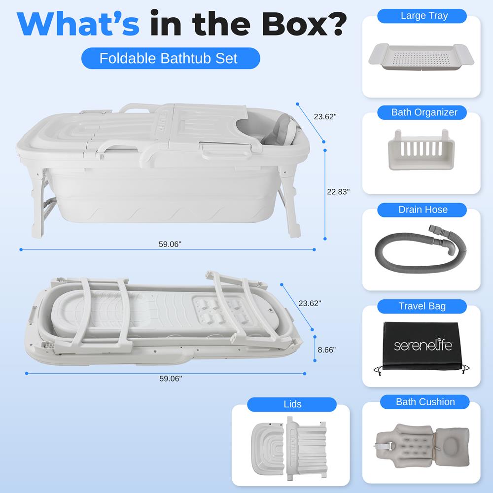 - Complete Set Includes a Bathtub, Lid, Tray, Bag, Stretch Drainage Pipe and Bath Cushion