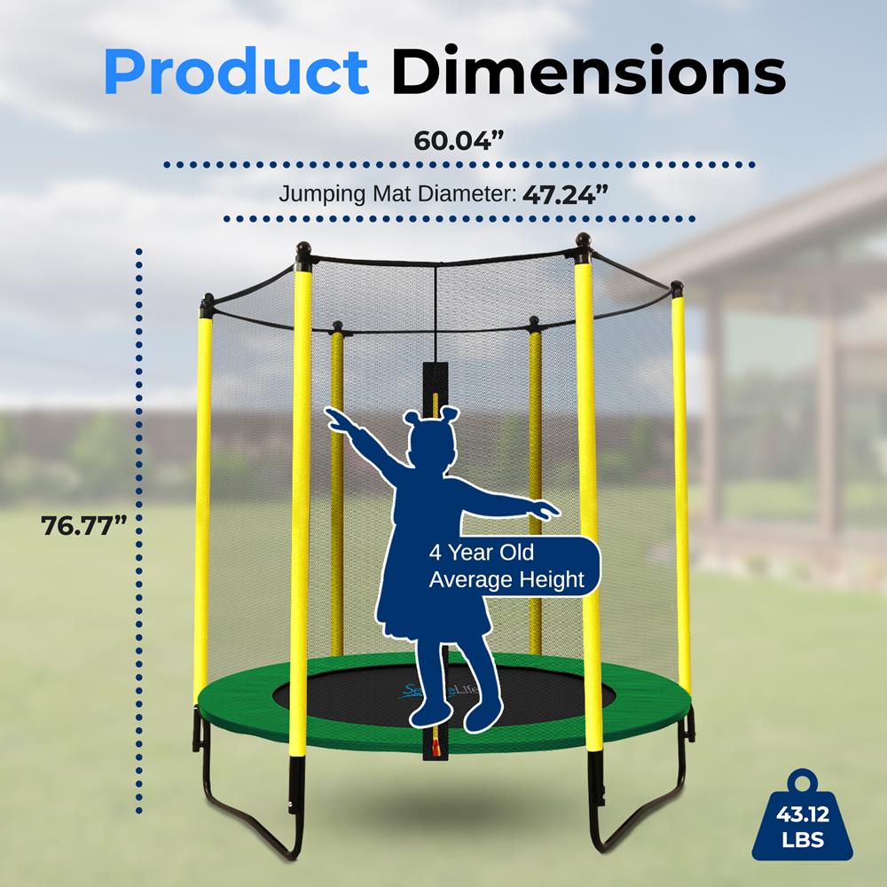- Total Assembled Trampoline Size (L x W x H): 60.04” x 60.04” x 76.77” – inches